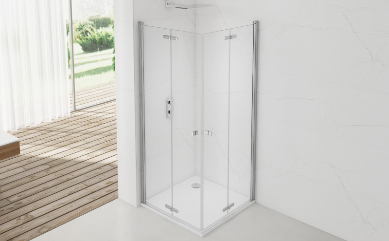 Sprchový kout s vaničkou a barvou profilů v lesklém chromu, výplň je z čirého skla bez dekoru. Produkt je opatřen povrchovou úpravou Easy Clean, která usnadňuje čistění a minimalizuje usazování vodního kamene. Zalamovací systém otevírání. Určení - levá i pravá orientace.
