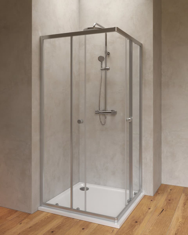 Sprchový kout s vaničkou a barvou profilů v lesklém chromu, výplň je z čirého skla bez dekoru. Posuvný systém otevírání. Určení - levá i pravá orientace.