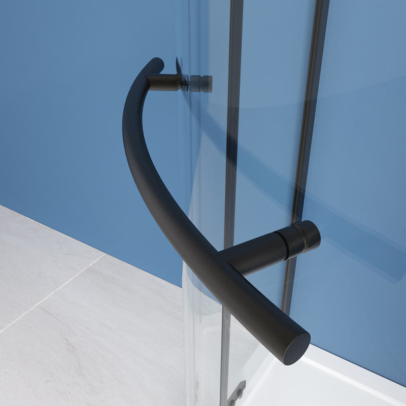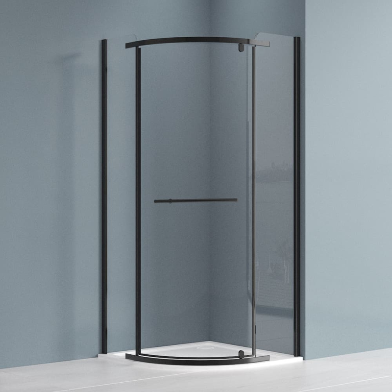 Sprchový kout bez vaničky a barvou profilů v černé barvě, výplň je z čirého skla bez dekoru. Pivotový systém otevirání. Určení - levá i pravá orientace.