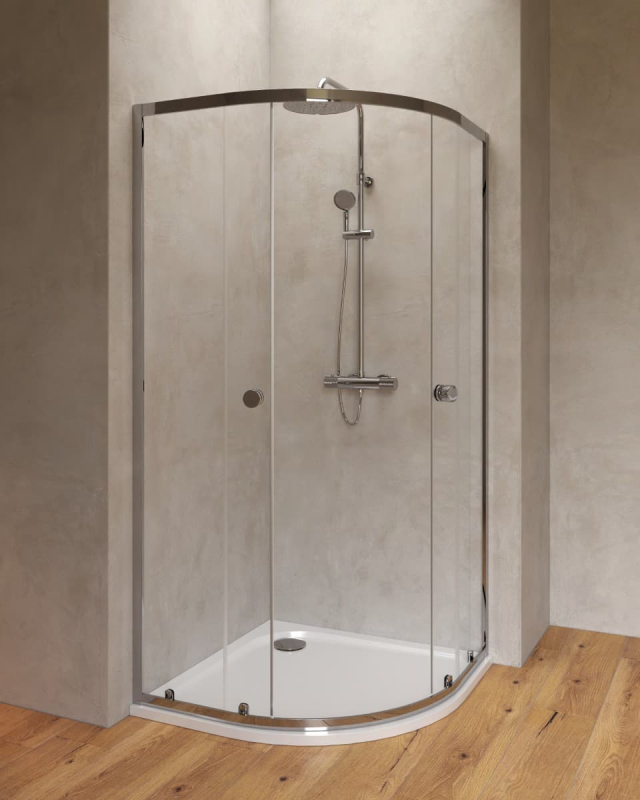Sprchový kout s vaničkou a barvou profilů v lesklém chromu, výplň je z čirého skla bez dekoru. Posuvný systém otevírání. Určení - levá i pravá orientace.