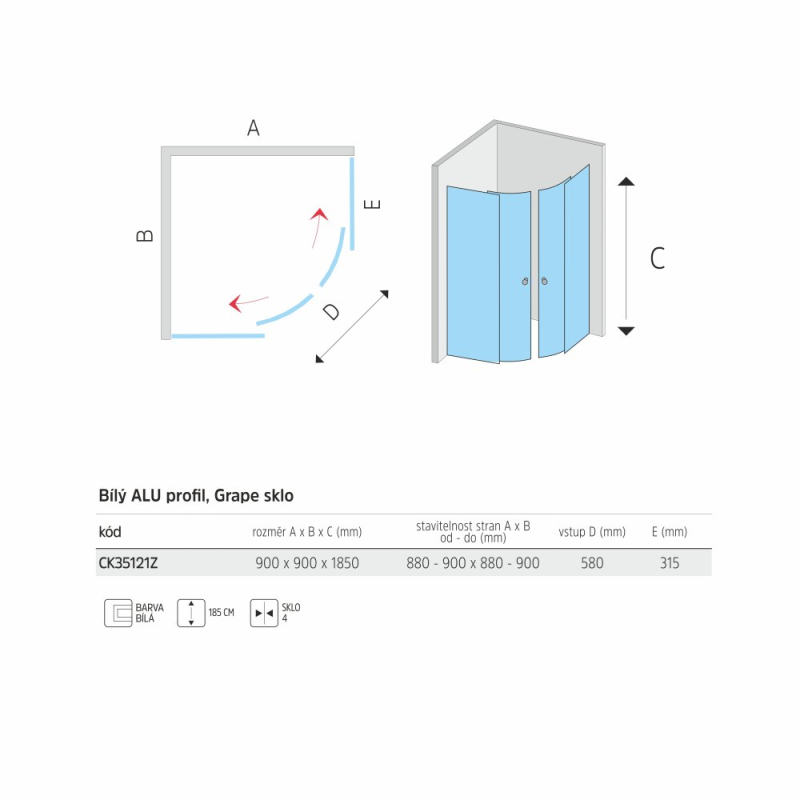 Hliníkové profily opatřené bílým nástřikem, sklo Grape, síla skla 4 mm, čtvrtkruh, rozměr 900x900 mm, výška 1850 mm, R 550.. Zobrazit více