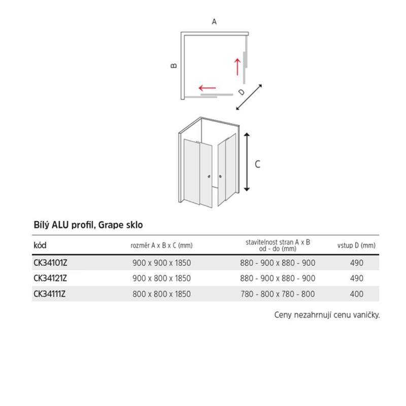 Hliníkové profily v bílé barvě, sklo Grape, síla skla 5 mm, obdélník, rozměr 900x800 mm, výška 1850 mm, elegantní madlo, dvoukolečkové ložiskové pojezdy.. Zobrazit více