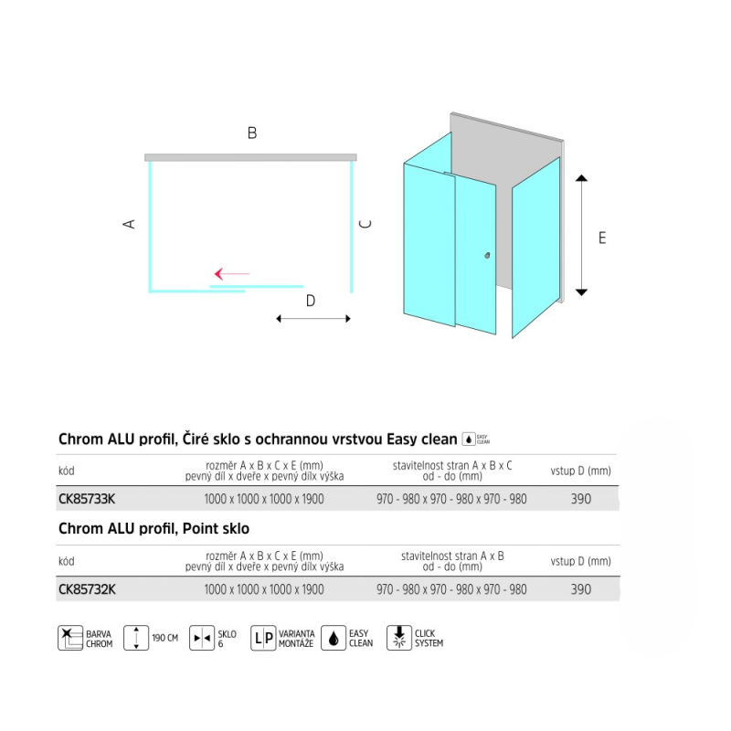 Hliníkové profily v barvě chrom, zasunovací dveře a dva pevné díly, sklo Point, síla skla 6 mm, čtverec, rozměr 1000x1000x1000 mm, výška 1900 mm.. Zobrazit více
