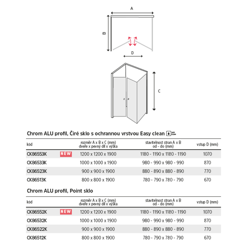 Hliníkové profily v barvě chrom, lítací dveře a pevný díl, sklo Point, síla skla 6 mm, čtverec, rozměr 1200 x 1200 mm, výška 1900 mm.. Zobrazit více