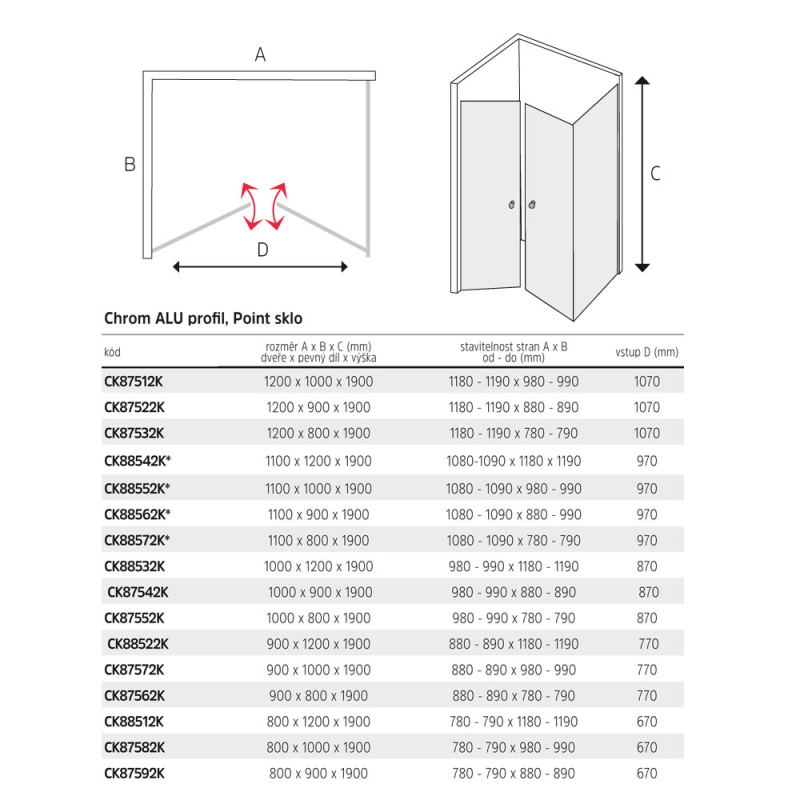 Lima sprchový kout, 110x120x190cm, lítací dveře a pev.díl, chrom ALU, sklo Point CK88542K