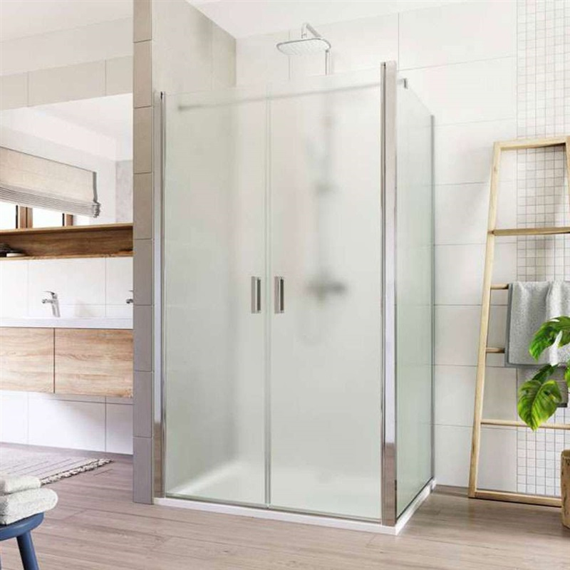Hliníkové profily v barvě chrom, lítací dveře a pevný díl, sklo Point, síla skla 6 mm, obdélník, 1100 (dveře) x 800 (pevný díl), výška 1900 mm.. Zobrazit více