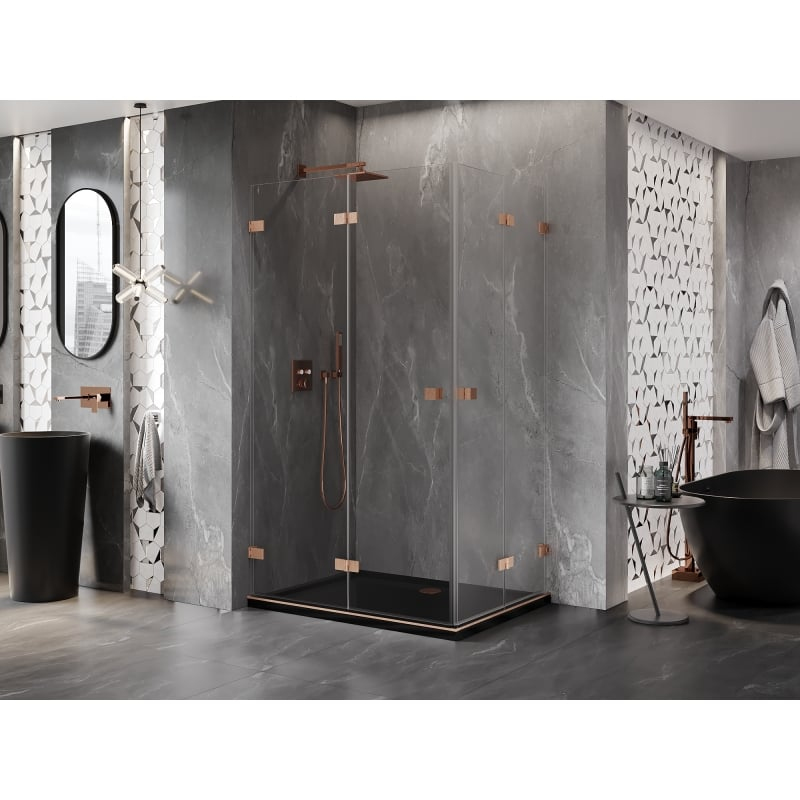 Specifikace produktu: Rozměr: 75x70 cm Výška: 200 cm Strana montáže: Univerzální Vchod: Skládací dveře Barva skla: Průhledná Povrchová úprava: Kartáčovaná měď Profil: Hliník Typ skla: Tvrzené Tloušťka skla: 6 mm Povrchová úprava pro snadné čištění Možnost nastavení šířky Dva montážní systémy: - S profilem, který umožňuje vyrovnání nerovností stěn - Bez profilu pro dokonale rovné stěny Možnost montáže na sprchovou vaničku nebo obklady Mosazné svorky a panty v jedné rovině se skleněnou tabulí Magnetický proužek a elastomerové těsnění pro odvod vody Hliníkový práh těsnění dveří