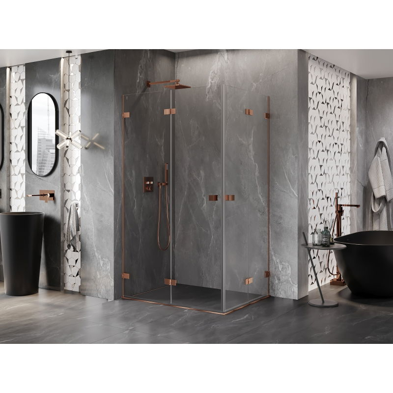 Specifikace produktu: Rozměr: 90x75 cm Výška: 200 cm Strana montáže: Univerzální Vchod: Skládací dveře Barva skla: Průhledná Povrchová úprava: Růžové zlato Profil: Hliník Typ skla: Tvrzené Tloušťka skla: 6 mm Povrchová úprava pro snadné čištění Možnost nastavení šířky Dva montážní systémy: - S profilem, který umožňuje vyrovnání nerovností stěn - Bez profilu pro dokonale rovné stěny Možnost montáže na sprchovou vaničku nebo obklady Mosazné svorky a panty v jedné rovině se skleněnou tabulí Magnetický proužek a elastomerové těsnění pro odvod vody Hliníkový práh těsnění dveří