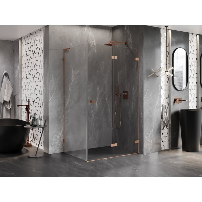 Specifikace produktu: Rozměr: 100x70 cm (pravé dveře 100 cm, stěna 70 cm) Výška: 200 cm Strana montáže: Pravá Vchod: Skládací dveře Barva skla: Průhledná Povrchová úprava: Kartáčovaná měď Profil: Hliník Úhlový stabilizátor L: Nerezová ocel Typ skla: Tvrzené Tloušťka skla: dveře 6 mm, stěna 8 mm Povlak pro snadné čištění Možnost nastavení šířky Dva montážní systémy: - S profilem, který umožňuje vyrovnání nerovností stěn - Bez profilu v případě dokonale rovných stěn Možnost montáže na sprchovou vaničku nebo obklady Mosazné svorky a panty v jedné rovině se skleněnou tabulí Magnetický proužek a elastomerové těsnění pro odvod vody Hliníkový práh těsnění dveří