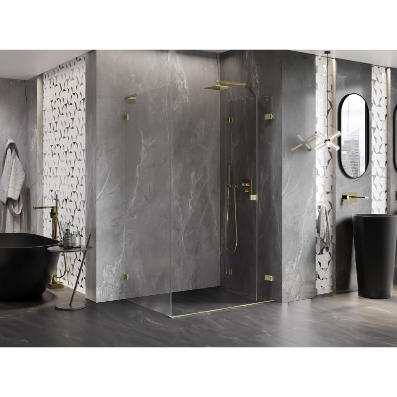 Specifikace produktu: Rozměr: 100x80 cm (pravé dveře 100 cm, stěna 80 cm) Výška: 200 cm Strana montáže: Pravá Vchod: Skládací dveře Barva skla: Průhledná Povrchová úprava: Kartáčované zlato Profil: Hliník Úhlový stabilizátor L: Nerezová ocel Typ skla: Tvrzené Tloušťka skla: dveře 6 mm, stěna 8 mm Povlak pro snadné čištění Možnost nastavení šířky Dva montážní systémy: - S profilem, který umožňuje vyrovnání nerovností stěn - Bez profilu v případě dokonale rovných stěn Možnost montáže na sprchovou vaničku nebo obklady Mosazné svorky a panty v jedné rovině se skleněnou tabulí Magnetický proužek a elastomerové těsnění pro odvod vody Hliníkový práh těsnění dveří