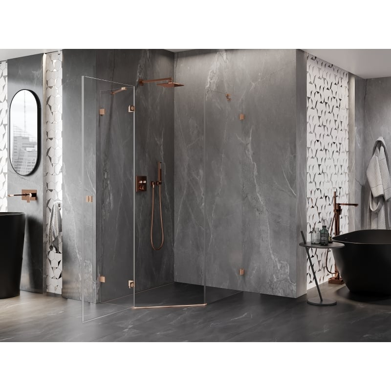Specifikace produktu: Rozměr: 80x100 cm (levé dveře 80 cm, stěna 100 cm) Výška: 200 cm Strana montáže: Levá Vchod: Dveře s otočnými panty Barva skla: Průhledná Povrchová úprava: Kartáčovaná měď Profil: Hliník Typ skla: Tvrzené Tloušťka skla: 8 mm Povrchová úprava pro snadné čištění Nastavitelná šířka Dva montážní systémy: - S profilem, který umožňuje vyrovnání nerovností stěn - Bez profilu pro dokonale rovné stěny Možnost montáže na sprchovou vaničku nebo obklady Mechanismus pro zvedání a spouštění dveří Mosazné svorky a panty v jedné rovině se skleněnou tabulí Magnetický proužek a elastomerové těsnění pro odvod vody Hliníkový práh těsnění dveří