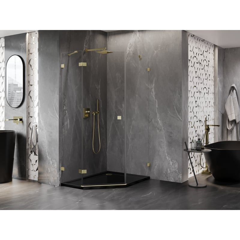 Sprchový kout Mexen Lunar pětiúhelníkový, levý, výklopný, 90 x 100 cm, průhledný, kartáčované zlato - 831-090L-100P-55-00-L
