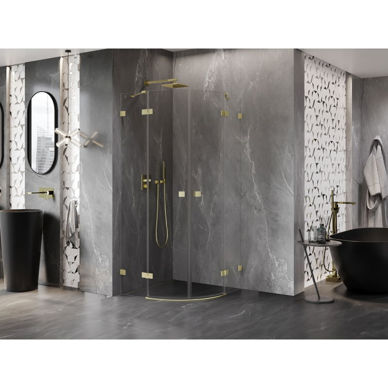 Specifikace produktu: Rozměr: 100x100 cm Výška: 200 cm Poloměr zakřivení R55 Strana montáže: Univerzální Vchod: Dveře s otočnými panty Barva skla: Průhledná Povrchová úprava: Kartáčované zlato Profil: Hliník Typ skla: Tvrzené Tloušťka skla: 8 mm Povrchová úprava pro snadné čištění Možnost nastavení šířky Dva montážní systémy: - S profilem, který umožňuje vyrovnání nerovností stěn - Bez profilu pro dokonale rovné stěny Možnost montáže na sprchovou vaničku nebo dlaždice Mechanismus pro zvedání a spouštění dveří Mosazné svorky a panty v jedné rovině se skleněnou tabulí Magnetický proužek a elastomerové těsnění pro odvod vody Hliníkový práh těsnění dveří