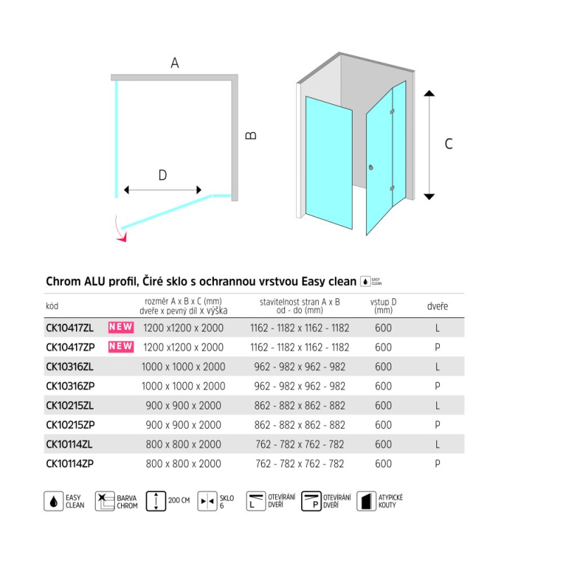 Výška 200 cm zvyšuje pohodlí při sprchování a omezuje únik vody mimo kout. Bezpečnostní čiré sklo o tloušťce 6 a 8 mm je opatřeno ochrannou vrstvou EASY CLEAN s nanotechnologií, která odpuzuje vodu, zabraňuje usazování nečistot a usnadňuje údržbu. Těsnost zajišťují magnetické, silikonové a stírací lišty doplněné prahovou lištou a okapničkou, které pomáhají odvádět vodu zpět do prostoru vaničky (není součástí balení).