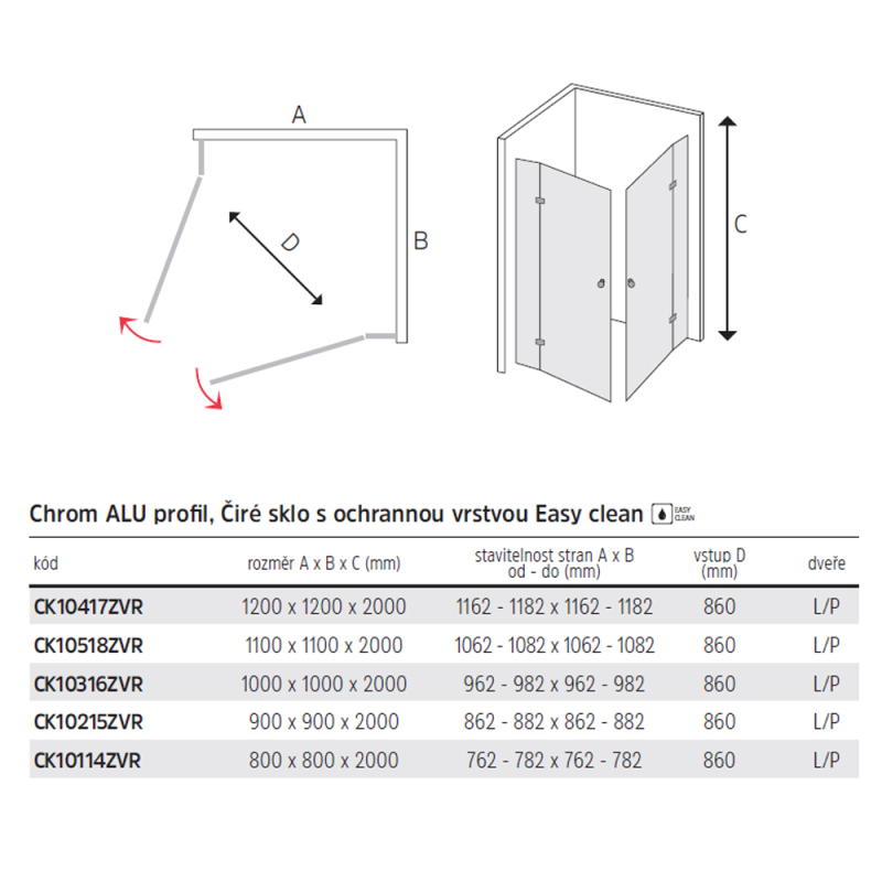 Hliníkové profily v barvě chrom, sklo Čiré, síla skla 6/6 mm, čtverec, rozměr 800x800 mm, výška 2000 mm, vstup rohem.. Zobrazit více