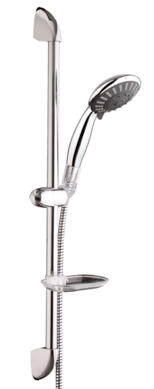 Sprchový set Basic obsahuje ruční sprchu s možností přepínání mezi třemi různými sprchovými proudy, posuvný jezdec pro nastavení potřebné výšky, kovovou hadici a sprchovou tyč.Součástí setu je i praktická mýdlenka.