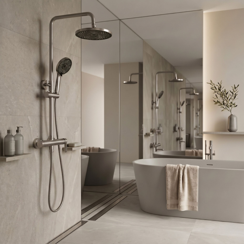 Sprchová sada Rea Arcos v titanovém provedení (Titanium) je kompletní koupelnový systém, který redefinuje luxus v technické, syrové formě. Navržena pro moderní koupelny, spojuje preciznost zpracování s výrazným designem. Srdcem sady je robustní baterie vybavená praktickým výtokem, dokončená magnetizujícím tmavým povrchem naneseným pokročilou technologií PVD.Robustní kovová konstrukce – tělo baterie a sprchový sloup jsou vyrobeny z vysoce kvalitní mosazi a nerezové oceli. Tato kombinace zaručuje stabilitu, odolnost proti korozi a dlouholetý bezporuchový provoz.Jedinečný odstín Titan PVD – hluboká grafitová barva se saténovou kartáčovanou strukturou dodává sadě prestižní industriální charakter. Vakuový PVD povlak zajišťuje extrémní tvrdost a odolnost proti poškrábání.Praktický spodní výtok – baterie je vybavena pevným výtokem, který výrazně zvyšuje funkčnost sady. Umožňuje pohodlné napouštění vany nebo rychlé opláchnutí nohou.Lehká a odolná dešťová sprcha ABS – velkoformátová hlavice poskytuje uklidňující dešťový proud. Materiál ABS je odolný proti usazování vodního kamene a nezatěžuje konstrukci sloupu.Sprchová hlavice s systémem Anti-Calc – ergonomická hlavice má silikonové trysky, které umožňují okamžité odstranění vodního kamene jedním pohybem ruky.Keramická kartuše třídy Premium – precizní směšovač zajišťuje plynulou regulaci teploty a proudu vody při zachování naprosté těsnosti.Nastavitelný sprchový sloup – stabilní tyč s posuvným držákem umožňuje snadné přizpůsobení výšky hlavice všem členům domácnosti.Pohodlný přepínač funkcí – intuitivní přepínač umožňuje efektivní řízení proudu vody mezi dešťovou sprchou, hlavicí a spodním výtokem.Rea Arcos Titan PVD s výtokem je sada, která spojuje profesionální standardy s unikátní estetikou. Díky přítomnosti výtoku a luxusnímu PVD povrchu se ideálně hodí k vanám s zástěnou i do prostorných sprchových koutů.