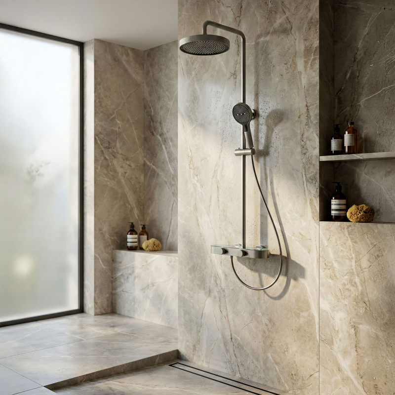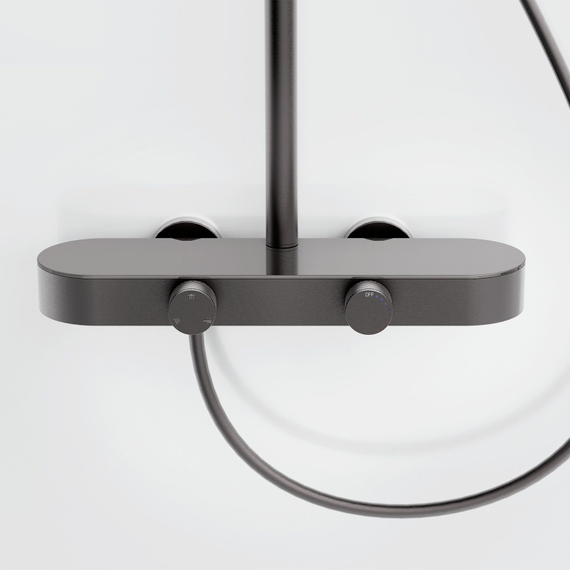 Sprchový set REA Creo Tytan je moderní nástěnné (nadzemní) řešení, které spojuje elegantní kartáčovaný odstín s pohodlím každodenního používání. Model je navržen s důrazem na funkčnost a estetiku, takže se skvěle hodí do moderních, loftových i industriálních koupelen. Plynulé ovládání otočnými knoflíky – baterie je vybavena dvěma ergonomickými knoflíky. První umožňuje přesné a pohodlné nastavení teploty vody, druhý slouží k přepínání režimů proudu mezi hlavovou sprchou, ruční sprchou a výtokem. Ruční sprcha s funkcí Bidetty – praktická ruční sprcha má tlačítko na zadní straně těla a další výstup nahoře. Po aktivaci může fungovat jako bidetová sprška, což usnadní rychlé opláchnutí sprchového koutu, umytí vaničky nebo naplnění vysokého kbelíku. Diskrétní kaskádový výtok – integrovaný výtok zajišťuje široký kaskádový proud, který se hodí při mytí rukou nebo napouštění nádoby bez nutnosti používat ruční sprchu. Technologie PVD – povrchová úprava je нанесena metodou PVD, což zaručuje mimořádnou tvrdost a odolnost proti poškrábání či zmatnění i při intenzivním používání. Pevná konstrukce – tělo baterie je vyrobeno z odolné mosazi, což se promítá do stability a dlouhé životnosti. Hlavová sprcha i ruční sprcha z ABS jsou lehké, praktické a snadno se udržují v čistotě. Skleněné zakončení baterie – horní plocha baterie je chráněna skleněnou deskou, která působí dekorativně a zároveň prakticky: baterie tak může sloužit i jako malá odkládací plocha na kosmetiku během sprchování. Komfortní přizpůsobení – tyč s nastavitelnou výškou umožňuje přizpůsobit polohu hlavové sprchy výšce uživatelů i uspořádání sprchové zóny. REA Creo Tytan je promyšlený sprchový set pro ty, kteří očekávají moderní vzhled a pohodlné ovládání. Funkční řešení a odolné materiály dělají každodenní sprchování komfortnější a intuitivnější.
