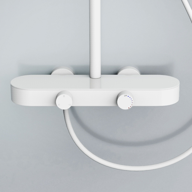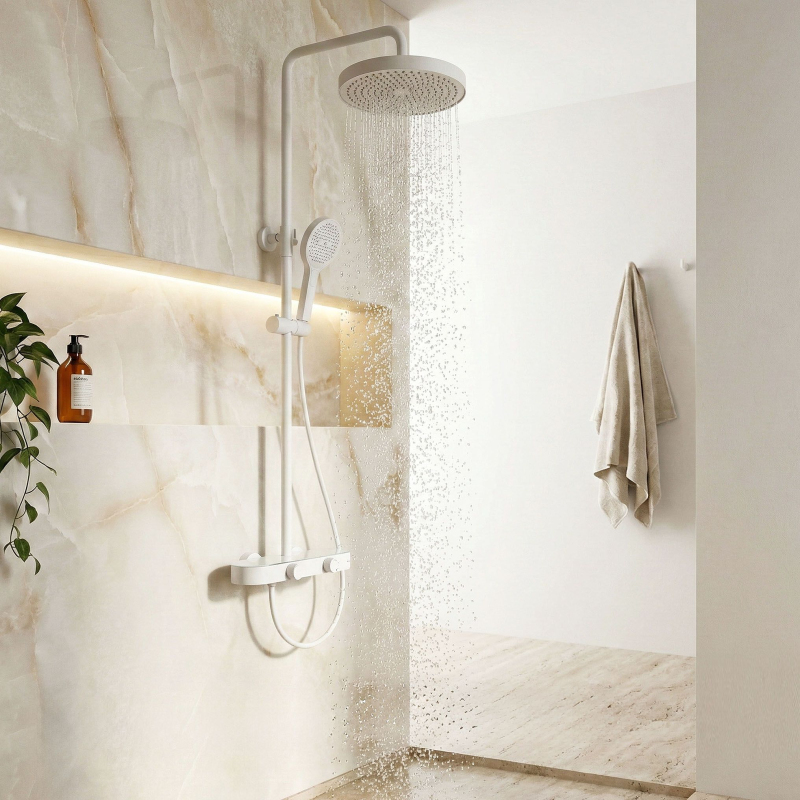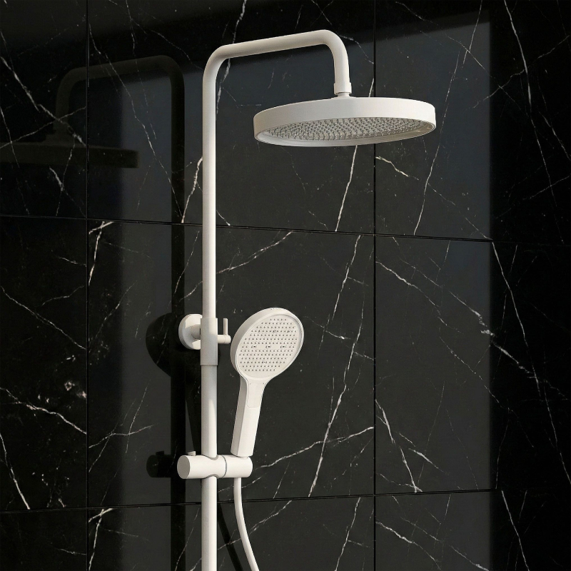 Sprchový set REA Creo Bílý je moderní nástěnné (nadzemní) řešení, které spojuje elegantní saténový odstín s pohodlím každodenního používání. Model je navržen s důrazem na funkčnost a estetiku, takže se skvěle hodí do moderních, loftových i industriálních koupelen. Plynulé ovládání otočnými knoflíky – baterie je vybavena dvěma ergonomickými knoflíky. První umožňuje přesné a pohodlné nastavení teploty vody, druhý slouží k přepínání režimů proudu mezi hlavovou sprchou, ruční sprchou a výtokem. Ruční sprcha s funkcí Bidetty – praktická ruční sprcha má tlačítko na zadní straně těla a další výstup nahoře. Po aktivaci může fungovat jako hygienická sprška, což usnadní rychlé opláchnutí sprchového koutu, umytí vaničky nebo naplnění vysokého kbelíku. Diskrétní kaskádový výtok – integrovaný výtok zajišťuje široký, kaskádový proud, který se hodí při mytí rukou nebo napouštění nádoby bez nutnosti používat ruční sprchu. Technologie Electroplating – matně bílé provedení bylo získáno metodou galvanizace. Povrch je hladký, odolný a rezistentní vůči vlhkosti i každodennímu používání. Pevná konstrukce – tělo baterie je vyrobeno z odolné mosazi, což se promítá do stability a dlouhé životnosti. Hlavová sprcha i ruční sprcha z ABS jsou lehké, praktické a snadno se udržují v čistotě. Skleněné zakončení baterie – horní plocha baterie je chráněna skleněnou deskou, která působí dekorativně a zároveň prakticky: baterie tak může sloužit i jako malá odkládací plocha na kosmetiku během sprchování. Komfortní přizpůsobení – tyč s nastavitelnou výškou umožňuje přizpůsobit polohu hlavové sprchy výšce uživatelů i uspořádání sprchové zóny. REA Creo Bílý je promyšlený sprchový set pro ty, kteří očekávají moderní vzhled a pohodlné ovládání. Funkční řešení a odolné materiály dělají každodenní sprchování komfortnější a intuitivnější.
