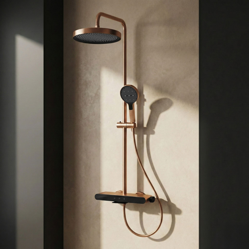 Dodejte své koupelně výjimečný, hřejivý charakter díky nástěnnému sprchovému setu Rea Farel Brush Copper. Tento model v provedení kartáčovaná měď je určen pro ty, kteří hledají alternativu ke zlatu a černé. Set kombinuje ušlechtilý kovový design s inovativní funkčností ovládání a udržování čistoty.Barva Brush Copper – elegantní měděný odstín s jemně kartáčovanou strukturou. Saténová povrchová úprava působí moderně a zároveň je praktická – na kartáčovaném povrchu jsou kapky vody a otisky prstů výrazně méně viditelné.PVD povlak – měděná barva byla nanesena technologií PVD (Physical Vapor Deposition). Jde o nejodolnější metodu barvení armatury, která zaručuje mimořádnou odolnost vůči poškrábání, zmatnění a korozi.Intuitivní panel Piano – baterie se ovládá pomocí tří mechanických tlačítek (kláves). Toto pohodlné řešení umožňuje bleskově přepínat proud vody mezi hlavovou sprchou, ruční sprchou a výtokem bez nutnosti otáčení ovladačů.Ruční sprcha s funkcí Bidetta – rukojeť sprchy skrývá další funkci. Má tlačítko na zadní straně a trysku na horní části těla. Po aktivaci se změní na bidetovou spršku, což usnadňuje čištění kabiny, mytí vaničky či napouštění vysokých misek.Diskrétní kaskádový výtok – tělo baterie je vybaveno širokým kaskádovým výtokem. Umožňuje rychlé naplnění kbelíku, misky nebo kontrolu teploty vody přímo u baterie.Materiály a regulace – srdcem setu je pevné tělo z mosazi. Hlavová i ruční sprcha z lehkého ABS mají systém proti usazování vodního kamene. Celek je upevněn na výškově nastavitelné tyči.Set Rea Farel Brushed Copper představuje spojení technologické přesnosti a jedinečného designu. Kartáčovaný měděný PVD povrch je výrazným akcentem interiéru a činí z něj jeden z nejodolnějších setů na trhu, připravený na každodenní používání.