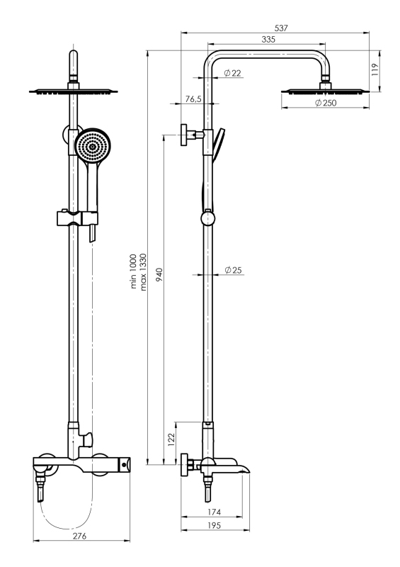- Regulovatelná výška hlavové sprchy 881 - 1211 mm