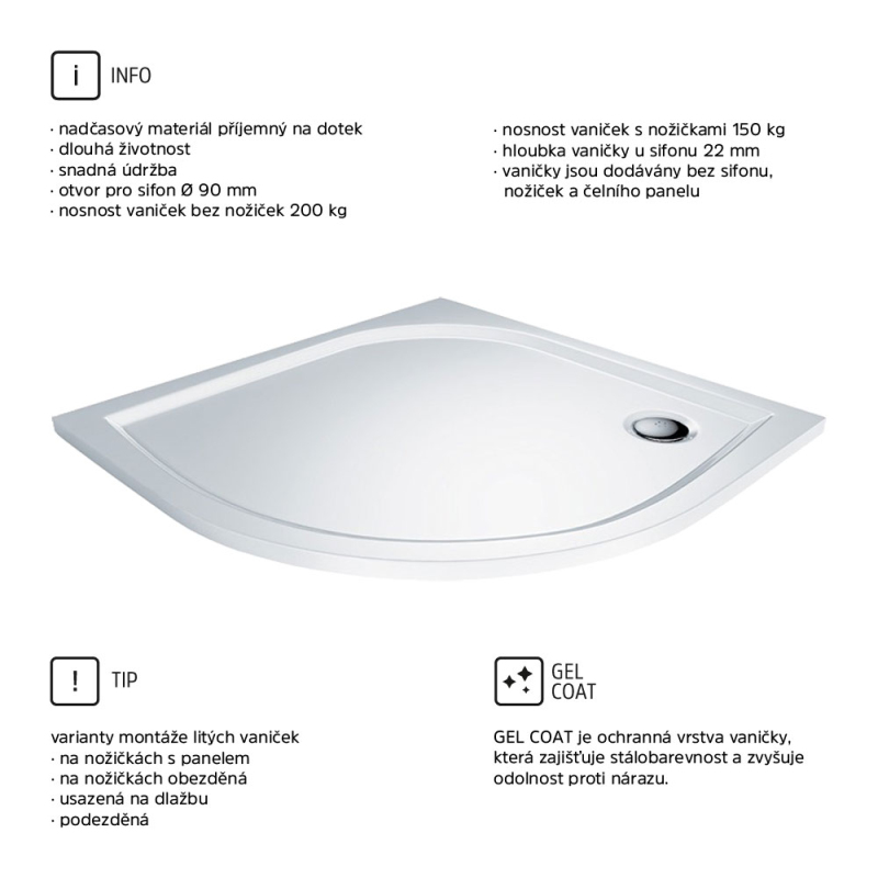 Sprchové vaničky z litého mramoru jsou opatřeny ochrannou vrstvou Gelcoat, která zajišťuje stálobarevnost a odolnost proti nárazu.