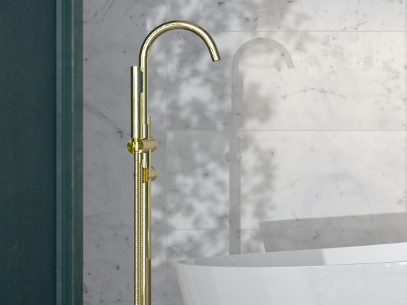 Stojánková baterie do podlahy vypadá skvěle v kombinaci s volně stojící vanou.