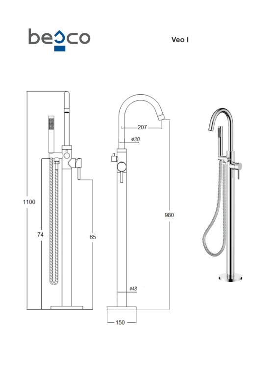 Vanová stojánková baterie je dodávána včetně příslušenství (montážní box, sprchová růžice a hadice). Jednoduchá montáž do podlahy díky instalačnímu boxu, který je součástí balení baterie.
