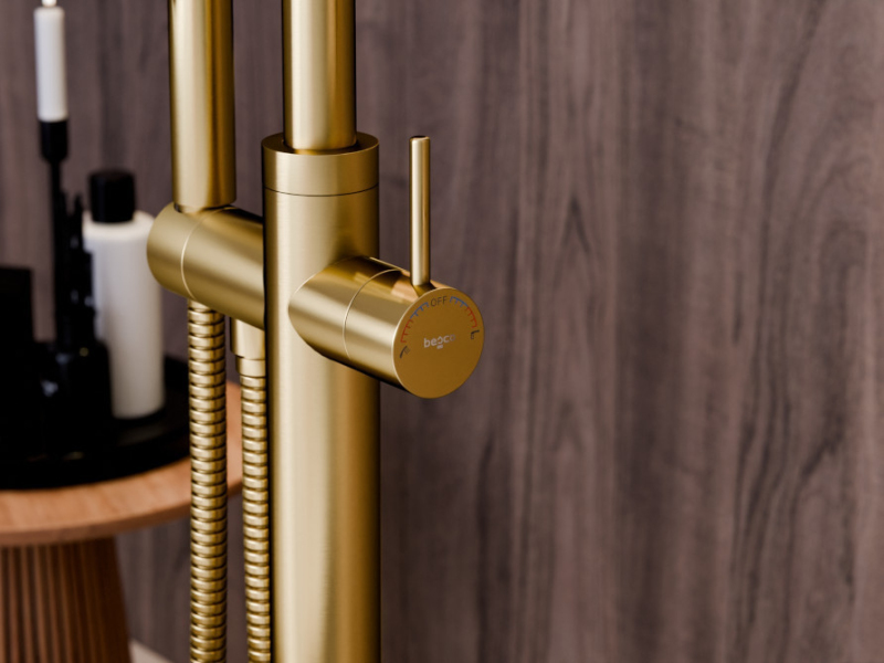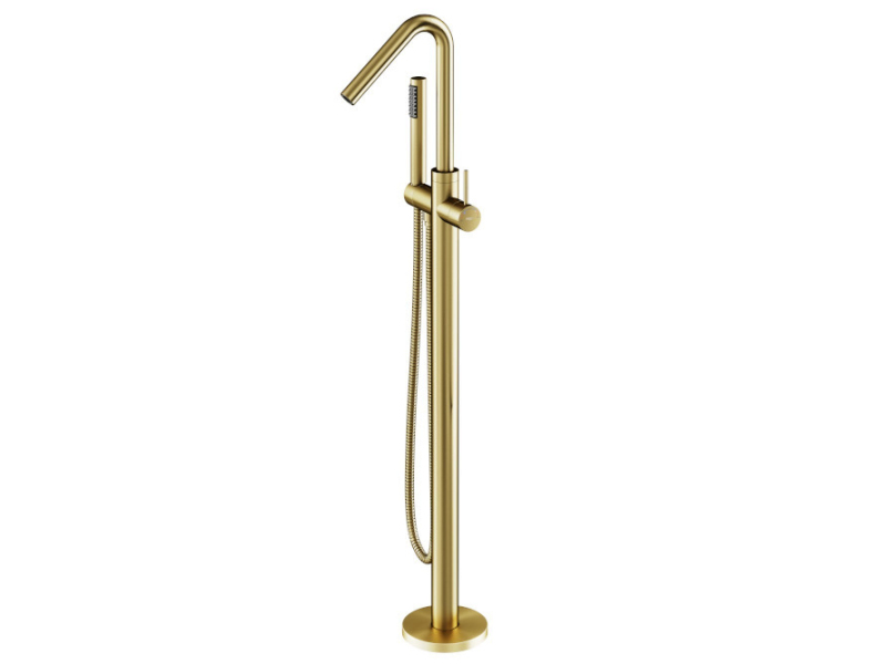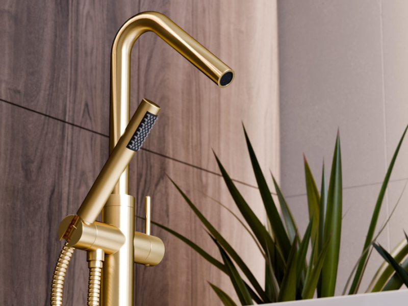 Stojánková baterie do podlahy vypadá skvěle v kombinaci s volně stojící vanou.