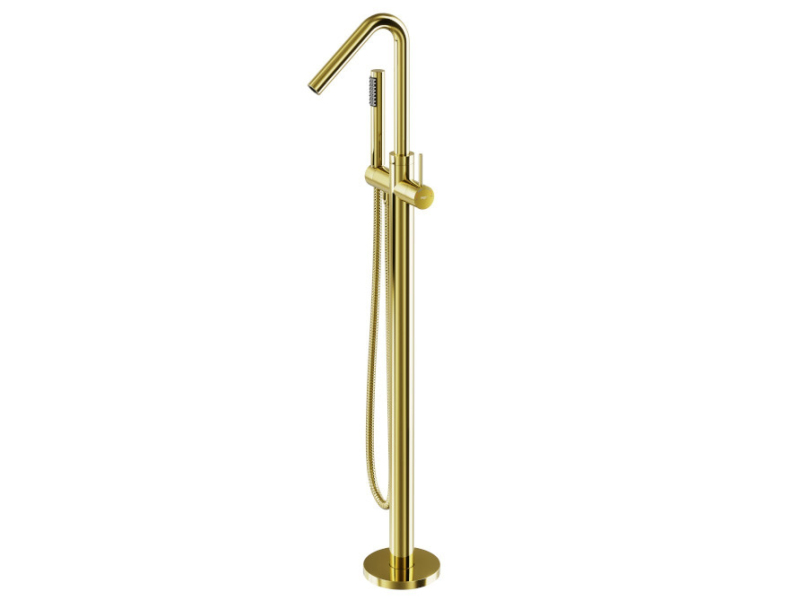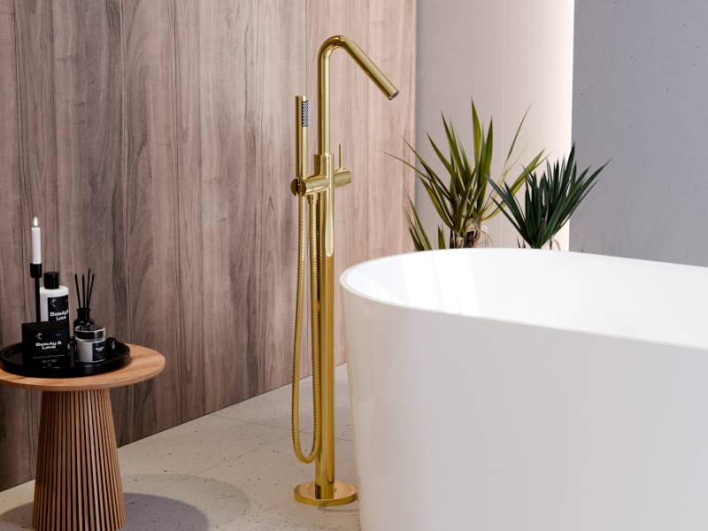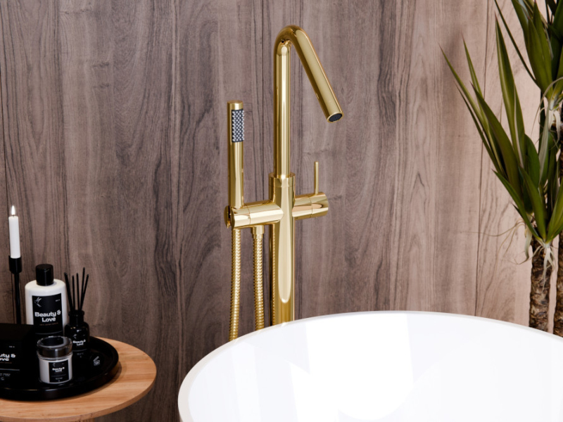 Stojánková baterie do podlahy vypadá skvěle v kombinaci s volně stojící vanou.