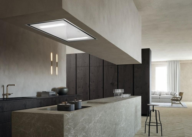 Stropní digestoř Faber Heaven Dual Light Flat KL A120 (120 cm) z nerezu a bílého skla pro úplné zapuštění do podhledu (výška jen 210 mm). Brushless motor A+ s perimetrálním sáním, výkon až 720 m³/h. 2× LED 4000 K, dálkové ovládání, Faber Cloud App, K‑LINK, doběh a 24h režim.