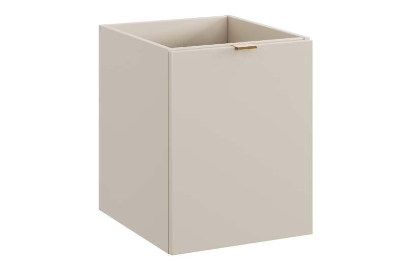 Szafka pod blat o szerokości 40 cm z koszem na pranie z kolekcji Dalia Cashmere to kwintesencja minimalistycznego stylu. Gładkie fronty, pozbawione zbędnych ozdobników, zachwycają prostotą, a wykończenie w odcieniu kaszmiru wprowadza do wnętrza łagodną, ciepłą atmosferę. Trzy kolory uchwytów – złoty połysk, chrom połysk oraz czarny mat – pozwalają na personalizację i dostosowanie mebli do indywidualnych preferencji.