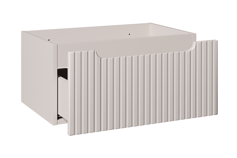 Szafka pod umywalkę o szerokości 60 cm z kolekcji Nova Cashmere przyciąga wzrok eleganckim minimalizmem, wyrazistymi pionowymi ryflowaniami i perfekcyjnie zintegrowanym podchwytem, który subtelnie podkreśla ponadczasowy charakter mebli. Delikatny dekor Kaszmirowy Beż wprowadza do wnętrza łagodną, ciepłą atmosferę. Kompatybilność z pozostałymi seriami Nova – w dekorach dębu Coast Evoke, bieli, czerni oraz niebieskiego Denimu – pozwala na pełną swobodę aranżacyjną i tworzenie spójnych, ale niepowtarzalnych przestrzeni.