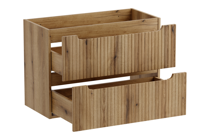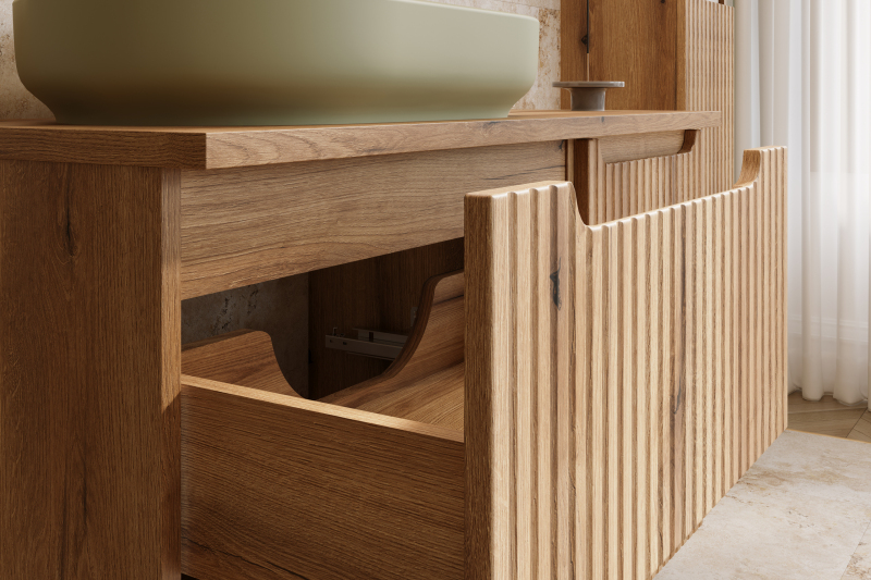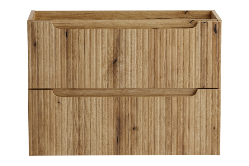 Szafka pod umywalkę 80 cm z dwiema szufladami z kolekcji Nova Coast Evoke przyciąga wzrok eleganckim minimalizmem, wyrazistymi pionowymi ryflowaniami i perfekcyjnie zintegrowanym podchwytem, który subtelnie podkreśla ponadczasowy charakter mebli. Ciepły odcień i naturalna struktura dekoru Dąb Coast Evoke sprawiają, że wnętrze nabiera miękkiego, przytulnego charakteru. Kompatybilność z pozostałymi seriami Nova – w kolorach kaszmiru, bieli, czerni oraz niebieskiego Denimu – pozwala na pełną swobodę aranżacyjną i tworzenie spójnych, ale niepowtarzalnych przestrzeni.