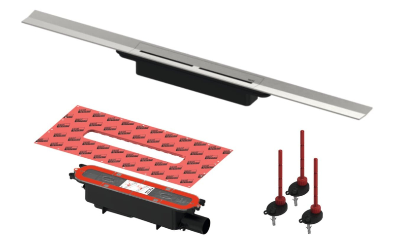 SET se skládá ze zkracovatelného profilu 90 cm, sifonu DN50 a nožiček.
