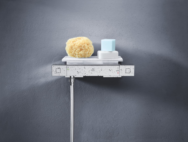 Termostatická nástěnná sprchová baterie. V hranatém designu. V chromovém provedení. Rozteč baterie 150 mm.