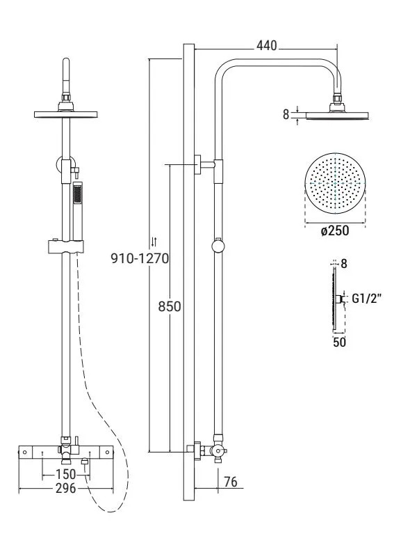 Set obsahuje baterii, hlavovou sprchu s držákem, vývod ze stěny s držákem, ruční sprchu a hadici
