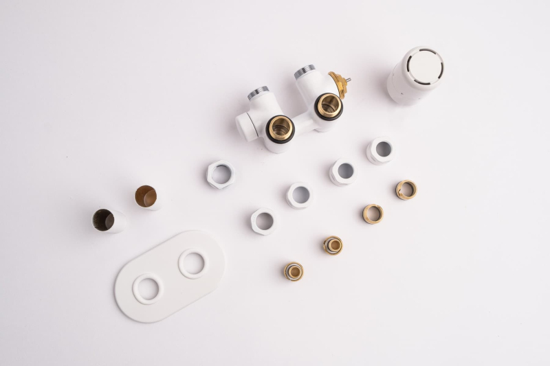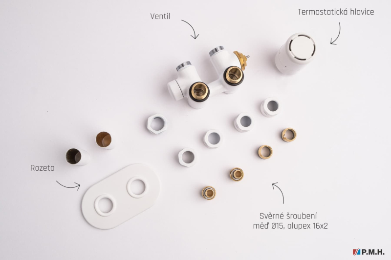 Sada pro kombinované vytápění v bílé lesklé barvě. Sada je pro tzv. středové připojení (50mm). Sada je vč. ovládací hlavice a krytek na trubky a otvoru ve zdi. Připojení je možné na měděné i plastové trubky.