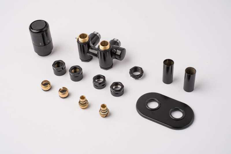 Sada pro kombinované vytápění v černé matné barvě. Sada je pro tzv. středové připojení (50mm). Sada je vč. ovládací hlavice a krytek na trubky a otvoru ve zdi. Připojení je možné na měděné i plastové trubky.