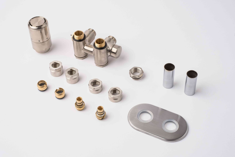 Sada z nerezu pro kombinované vytápění. Sada je pro tzv. středové připojení (50mm). Sada je vč. ovládací hlavice a krytek na trubky a otvoru ve zdi. Připojení je možné na měděné i plastové trubky.