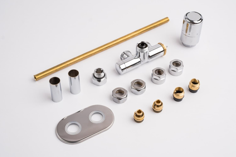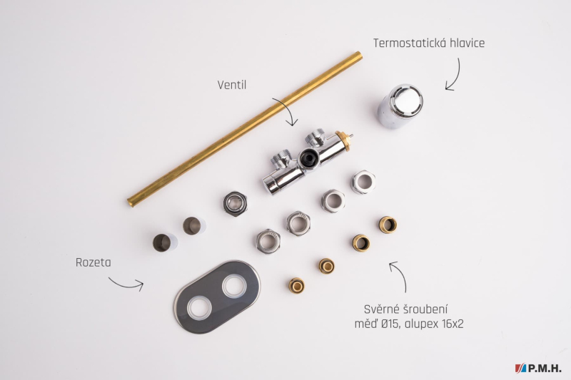 Sada pro kombinované vytápění v chromovém provedení. Sada je pro tzv. jednobodové připojení tzn. obě trubky jsou na jedné straně radiátoru. Sada je vč. ovládací hlavice a krytek na trubky a otvoru ve zdi. Připojení je možné na měděné i plastové trubky.