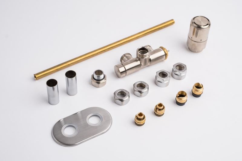Sada z nerezu pro kombinované vytápění. Sada je pro tzv. jednobodové připojení tzn. obě trubky jsou na jedné straně radiátoru. Sada je vč. ovládací hlavice a krytek na trubky a otvoru ve zdi. Připojení je možné na měděné i plastové trubky.