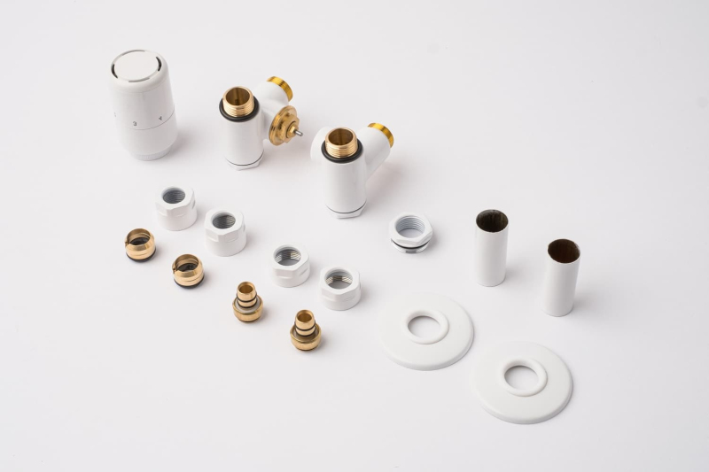 Sada pro kombinované vytápění v bílé lesklé barvě. Sada je pro připojení tzv. na rozteč tzn. po stranách radiátoru. Sada je vč. ovládací hlavice a krytek na trubky a otvoru ve zdi. Připojení je možné na měděné i plastové trubky.