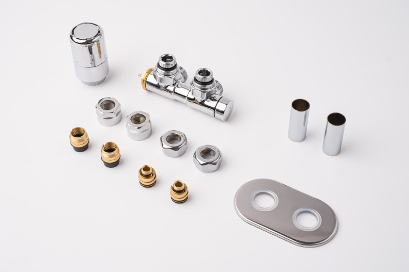 Sada pro kombinované vytápění v chromovém provedení.Sada je pro tzv. středové připojení (50mm). Sada je vč. ovládací hlavice a krytek na trubky a otvoru ve zdi. Připojení je možné na měděné i plastové trubky.