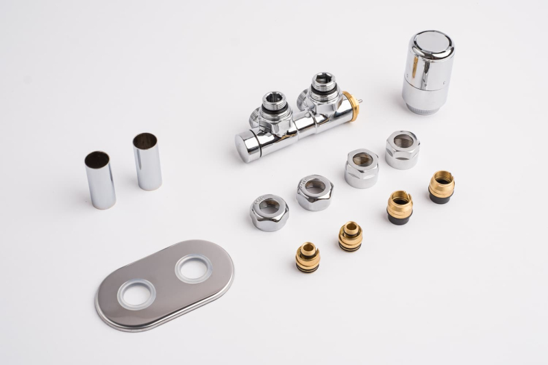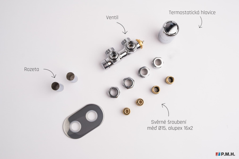 Sada pro kombinované vytápění v chromovém provedení.Sada je pro tzv. středové připojení (50mm). Sada je vč. ovládací hlavice a krytek na trubky a otvoru ve zdi. Připojení je možné na měděné i plastové trubky.