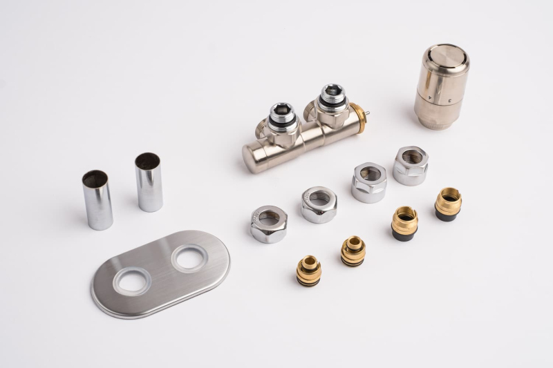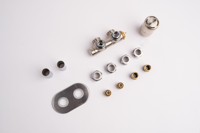Sada z nerezu pro kombinované vytápění. Sada je pro tzv. středové připojení (50mm). Sada je vč. ovládací hlavice a krytek na trubky a otvoru ve zdi. Připojení je možné na měděné i plastové trubky.