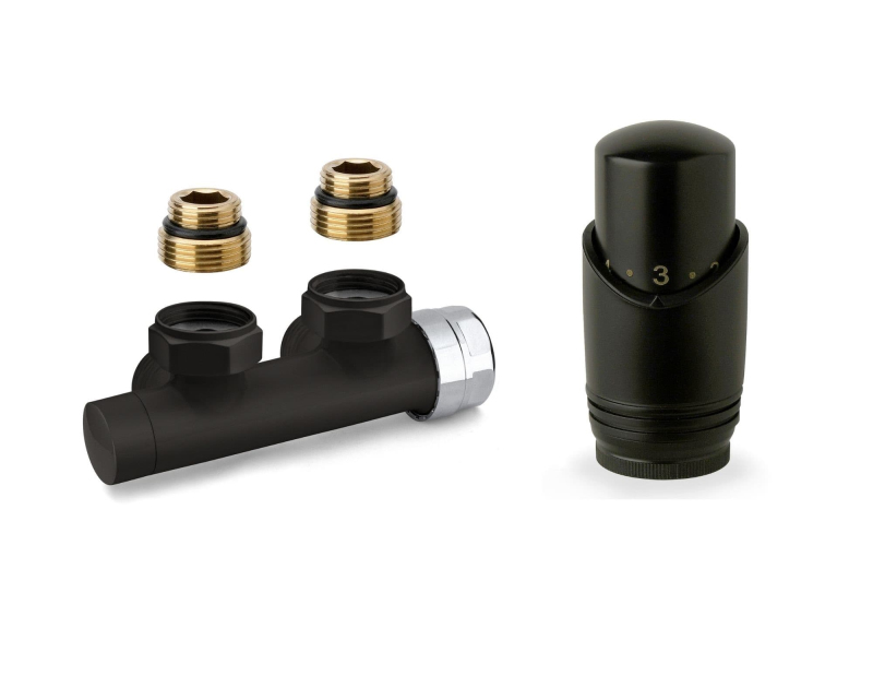 Termostatický ventil pro středové připojení radiátoru v moderní černé matné barvě.
