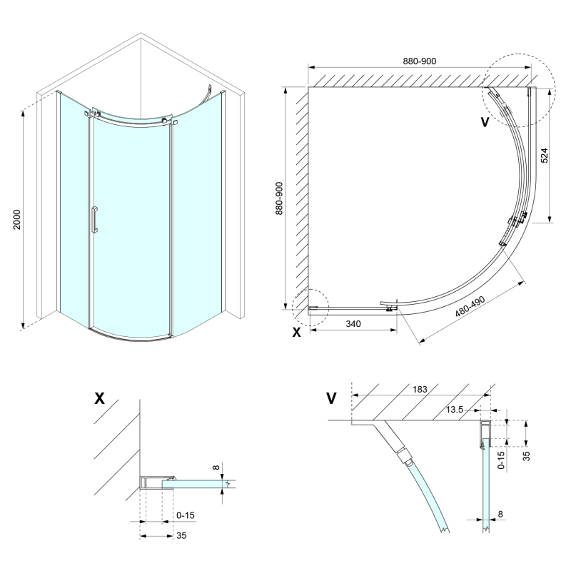 THRON ROUND čtvrtkruhová sprchová zástěna 900x900mm, čiré sklo, pravá