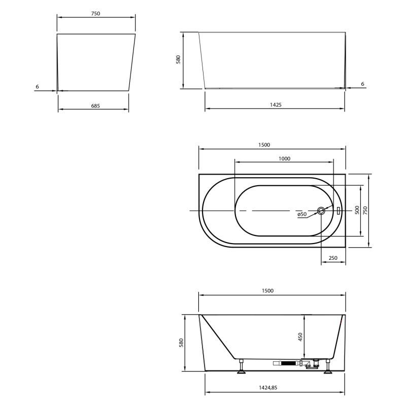 - Součástí vany je přepadová souprava, výpust s click-clack zátkou mosaz/chrom a sifon