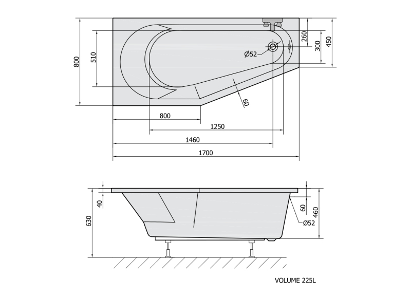 TIGRA L asymetrická vana 170x80x46cm, bílá 90111